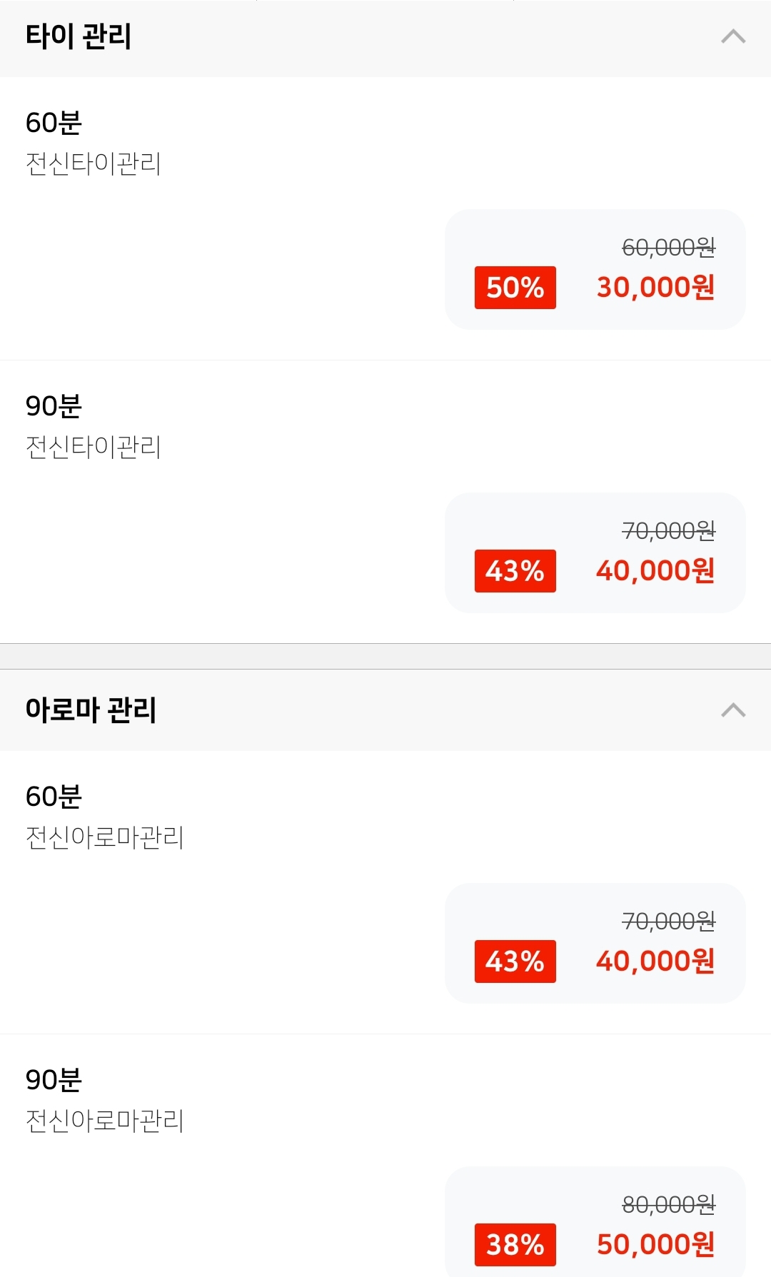 마사지 코스 및 메뉴 프로그램