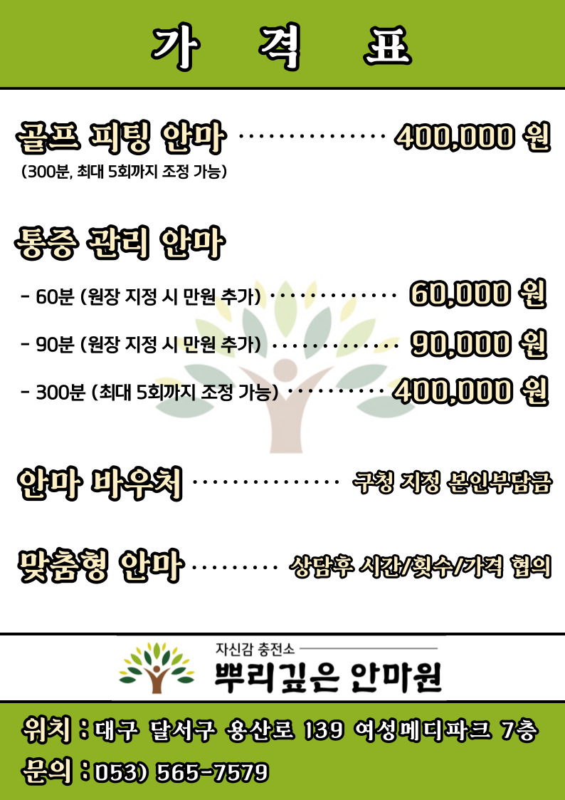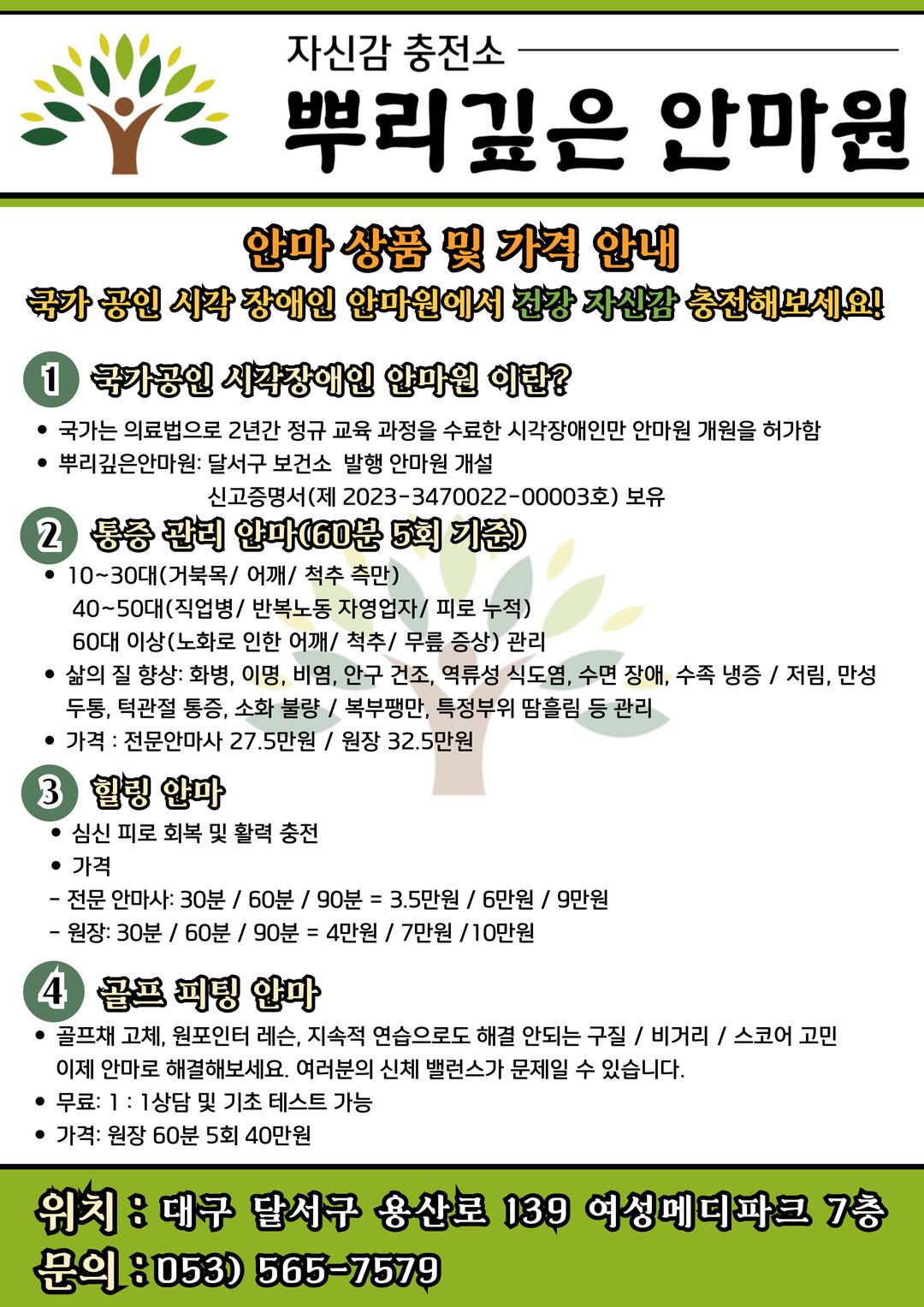 *뿌리깊은안마원 : 달서구 보건소 발행 안마원 개설 신고증명서(제 2023-3470022-00003호) 보유한 건전업소 임